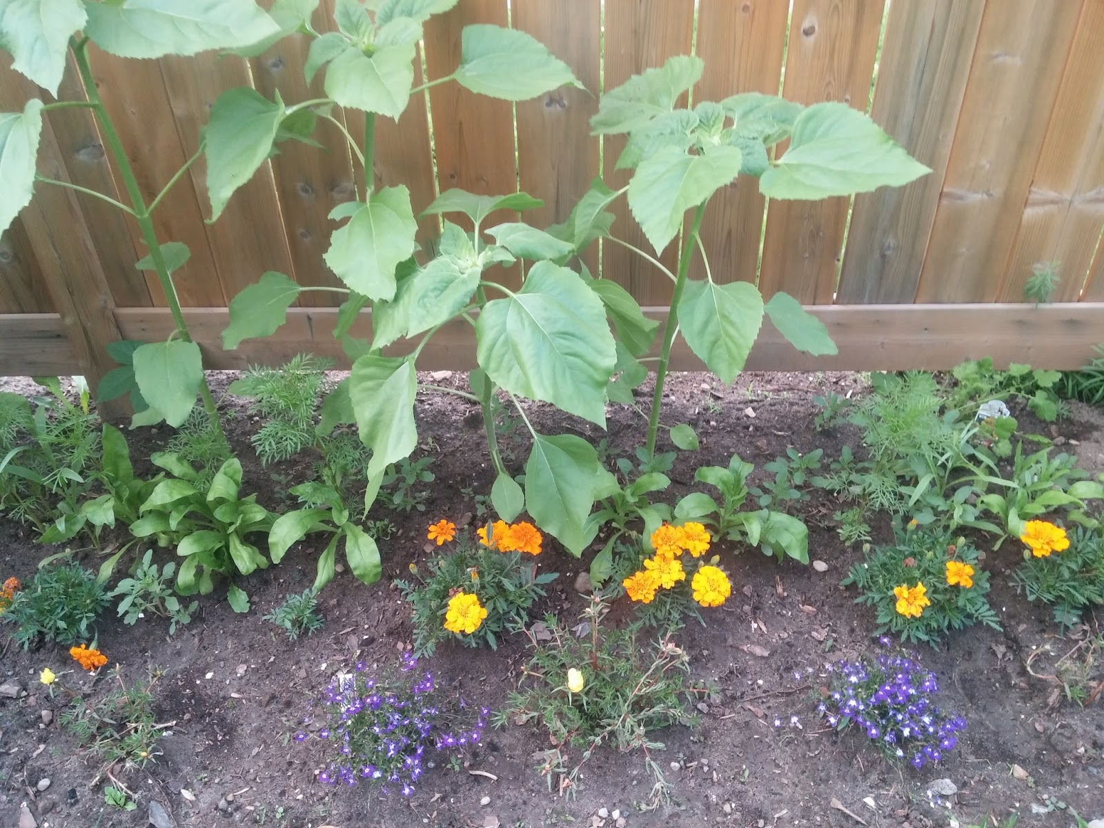These are GIANT sunflowers! I think they will look nice against the fence, if the voracious squirrels leave them alone (my neighbors have warned me).